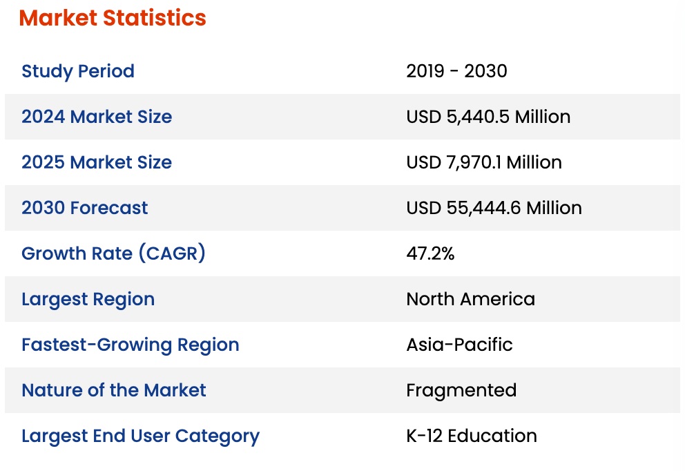 But the most interesting part of the above statistic showing the Fastest-Growth Region is Asia-Pacific, this shows very promising potential growth for the region. AI is also been applied sooner in the Education roadmap, which is not only for the "After K-12" anymore, but the Largest End User Category is switched now to K-12 Education. It's a great opportunity now for children to capture AI technology soon, just like how English language is been applied before, AI will be "the second global language" around the world. This will give a clear picture of the new standard for professional & international employees: English communication skills & AI skills. Maybe in the future, with the help of AI in language translation, people may not need to learn English by the end.