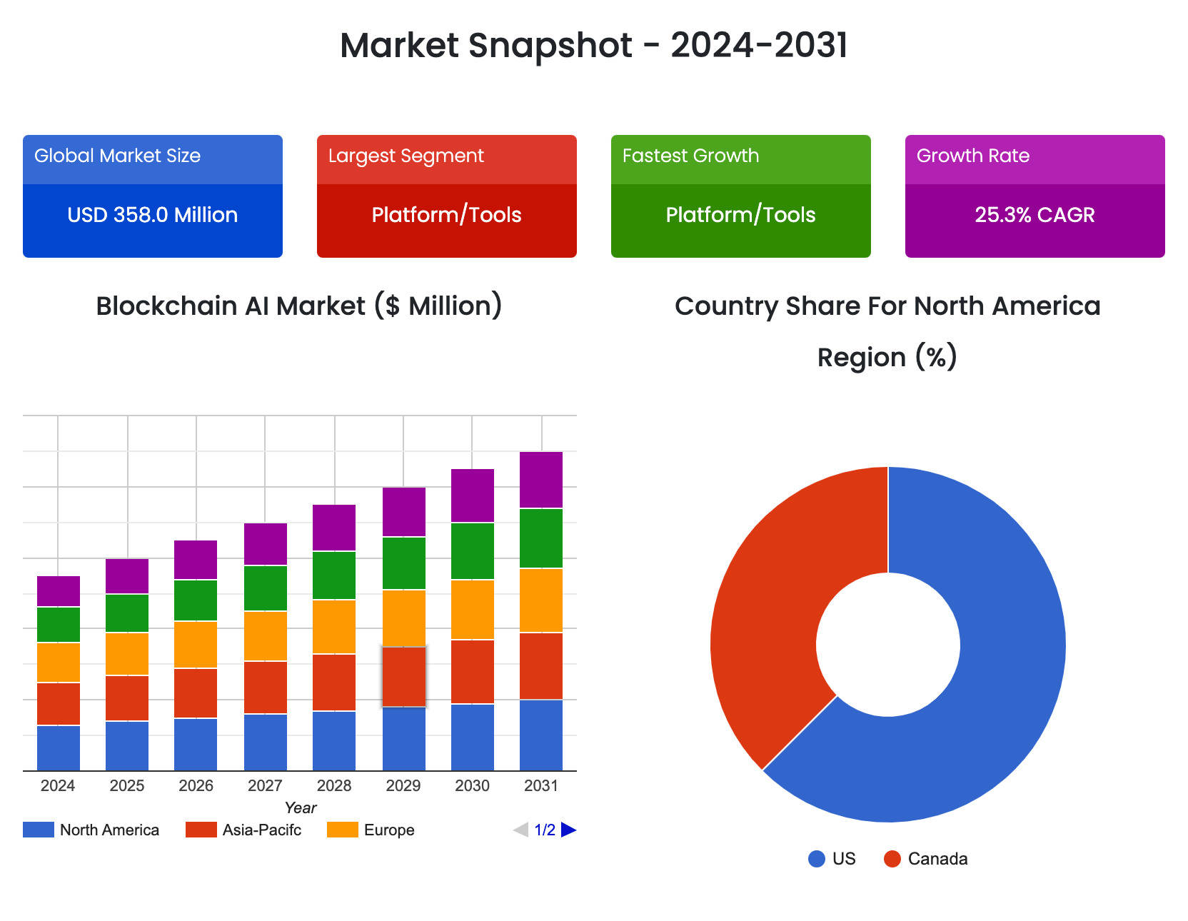 Global Blockchain AI Market size was valued at USD 358.0 Million in 2022 and USD 448.5 Million in 2023 to reach USD 2,725.2 Million by 2031, at a CAGR of 25.3% during the forecast period (2024-2031).