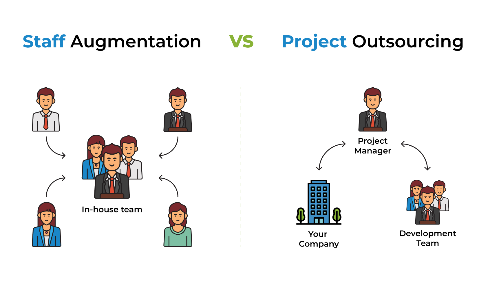 Unlike project outsourcing, where the work is typically managed by an external team, staff augmentation integrates external resources into the client's Agile environment. Here, the team consists of both the client’s and vendor’s resources—sometimes from multiple vendors—working together with a shared focus on the product roadmap and business development.