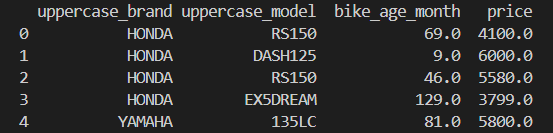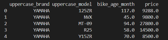 We create appropriate features that help in improving the accuracy of the model. The features that are selected: Brand, Model, and Bike_age_month (how old a motorcycle is, from its manufacture time to now, in months). The target variable: Selling price.