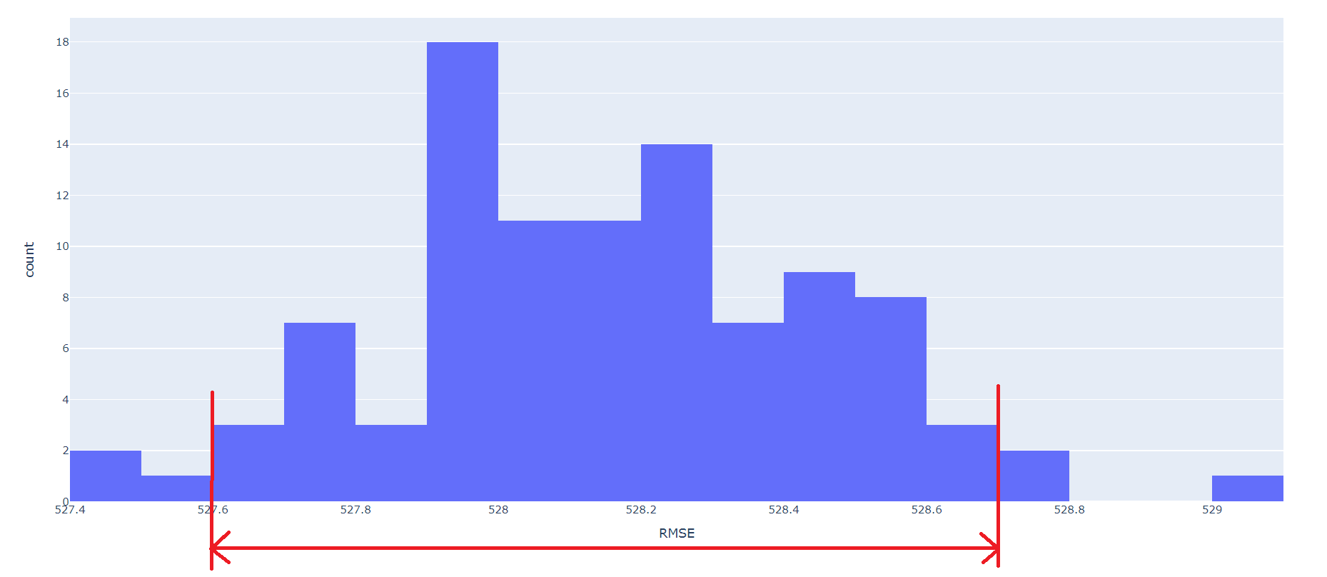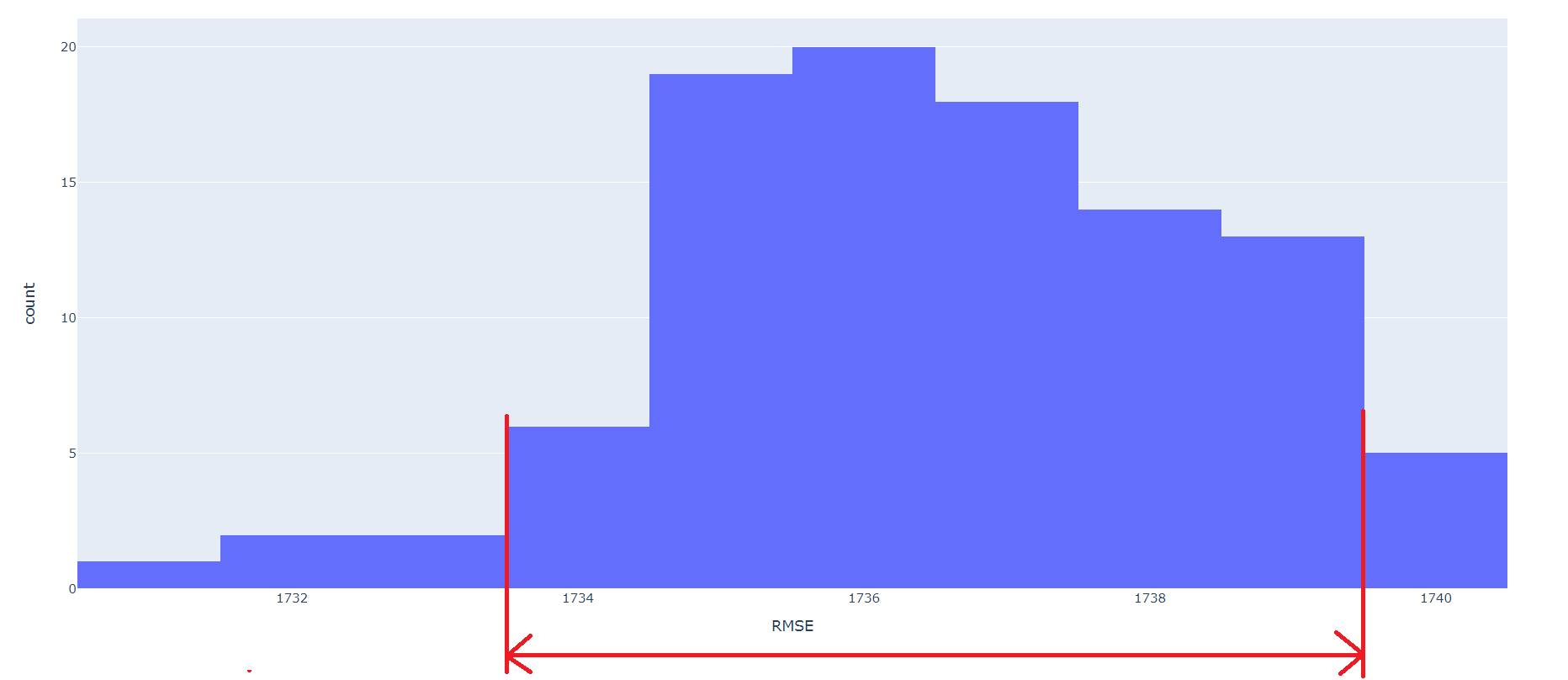 With our algorithm of choice being Random forest in both Low and High datasets, next we need to determine the range of RMSE of models created by the algorithm and the likelihood that the RMSE of a model from that same algorithm will fall between that range when making predictions on new data - i.e. the confidence interval for the chosen algorithm in each dataset. In our case, we opt for the 95% confidence level.