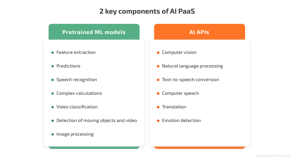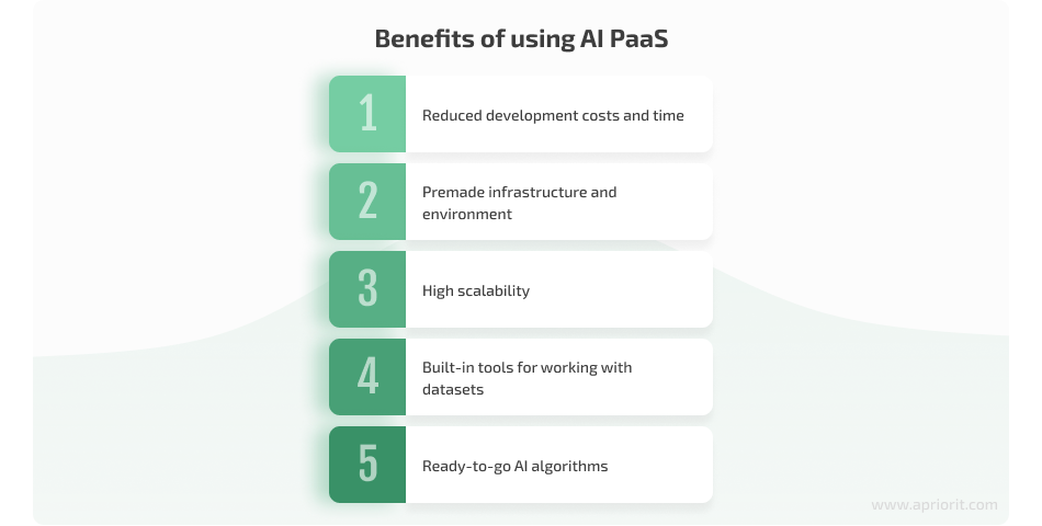 AI itself is all about processing enormous amounts of data, which, in turn, requires extensive computing power. This is why, similar to the standard PaaS model, many AI service providers offer infrastructure resources, computing resources, and virtualization capabilities. All the big data required for training ML models and improving AI solutions needs to be stored somewhere.