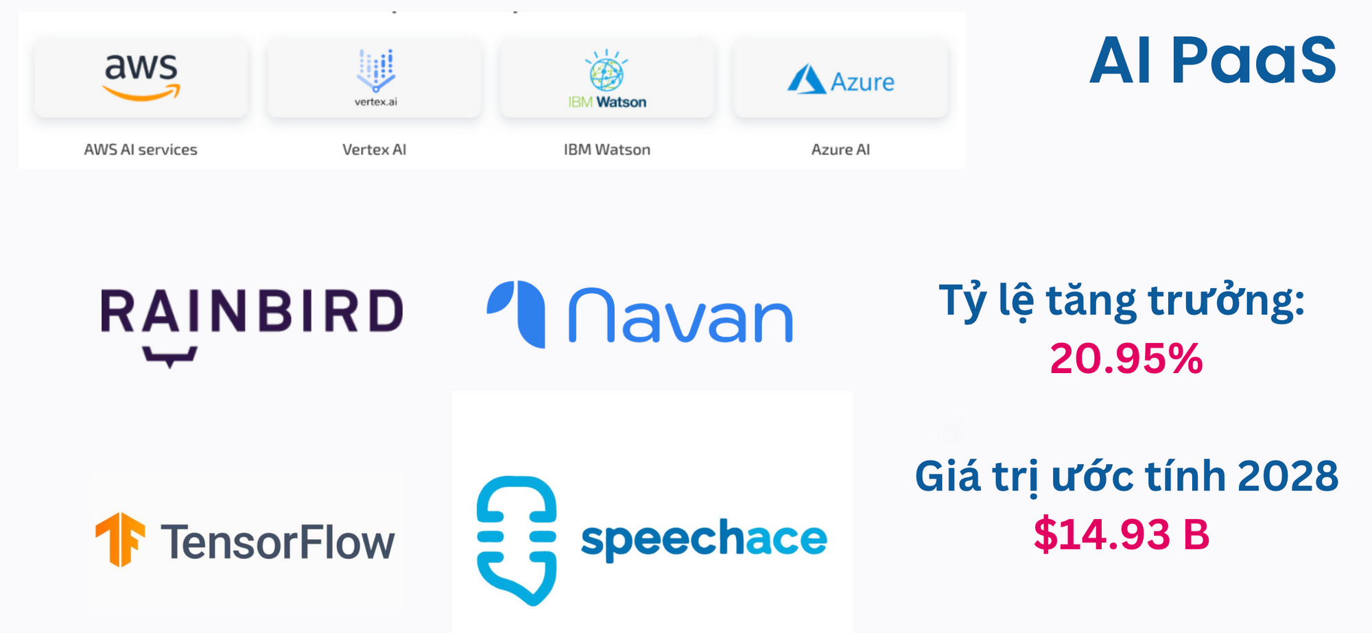 This is a very competitive market because of the presence of 04 tech giants: AWS, Google (Vertex AI), IBM and Microsoft (Azure). Based on the great advantages of cloud services, the 04 tech giants continue their big investment on AI PaaS solutions, both with Pre-trained models and AI APIs.