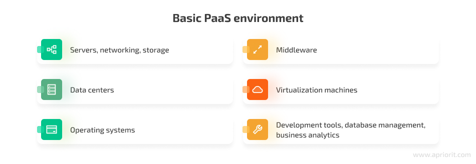 With PaaS, a cloud vendor provides an environment for building, deploying, and maintaining applications. A basic PaaS environment usually includes two main groups of components required for application development: infrastructure and a platform.