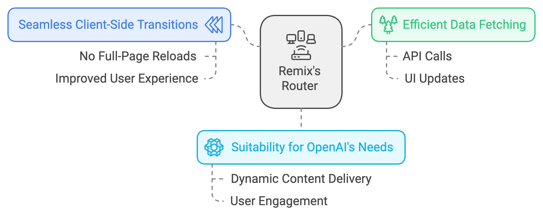 Remix’s router is designed to handle client-side transitions seamlessly, without needing to reload the entire page. When switching between routes, Remix fetches only the data needed for the next page via API calls and updates the UI. This is a big win for OpenAI’s dynamic application, where the focus is on delivering content quickly and keeping users engaged without the delay of full-page reloads.